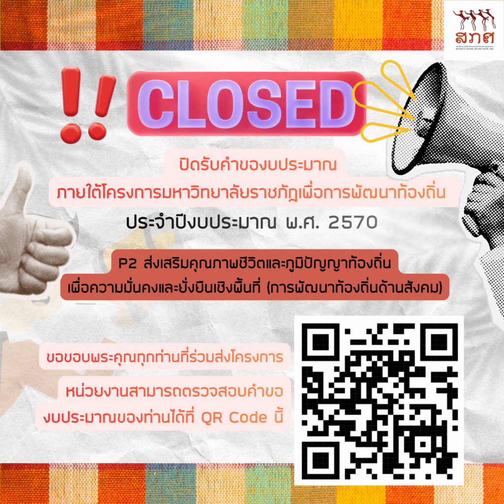 กิจกรรม, ข่าวเเละประกาศ ปิดรับคำของบประมาณเรียบร้อยแล้ว โครงการมหาวิทยาลัยราชภัฏเพื่อการพัฒนาท้องถิ่น ปีงบประมาณ 2570 (P2) Post Views: 14 ปิดรับคำของบประมาณเรียบร้อยแล้ว โครงการมหาวิทยาลัยราชภัฏเพื่อการพัฒนาท้องถิ่น ปีงบประมาณ 2570 (P2) ขอบคุณทุกท่านที่ร่วมขับเคลื่อนการพัฒนาท้องถิ่นไปด้วยกัน ตรวจสอบข้อมูลผ่าน QR Code ได้เลยค่ะ