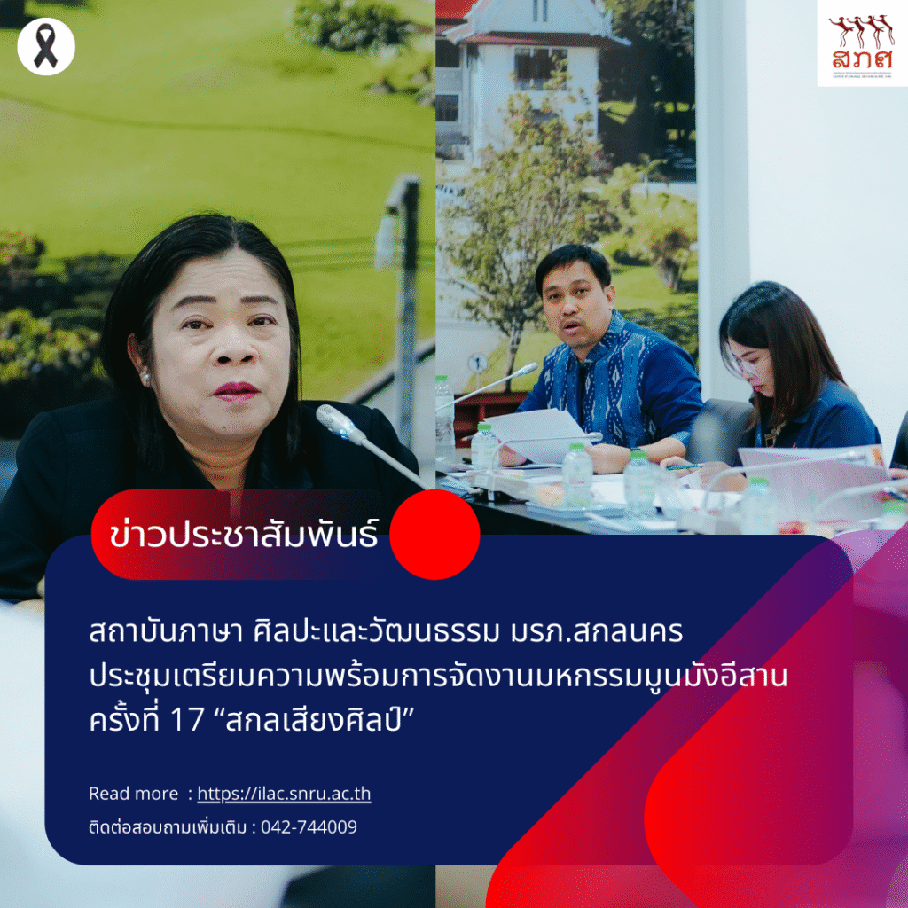 วันพฤหัสบดีที่ 22 มกราคม พ.ศ. 2569 เวลา 13.30 น. เป็นต้นไป มหาวิทยาลัยราชภัฏสกลนคร โดยสถาบันภาษา ศิลปะและวัฒนธรรม ได้จัดการประชุมเตรียมความพร้อมการดำเนินงานมหกรรมมูนมังอีสาน ครั้งที่ 17 “สกลเสียงศิลป์” ณ ห้องประชุมสุวรรณภิงคาร ชั้น 2 อาคาร 1 สถาบันภาษา ศิลปะและวัฒนธรรม มหาวิทยาลัยราชภัฏสกลนคร